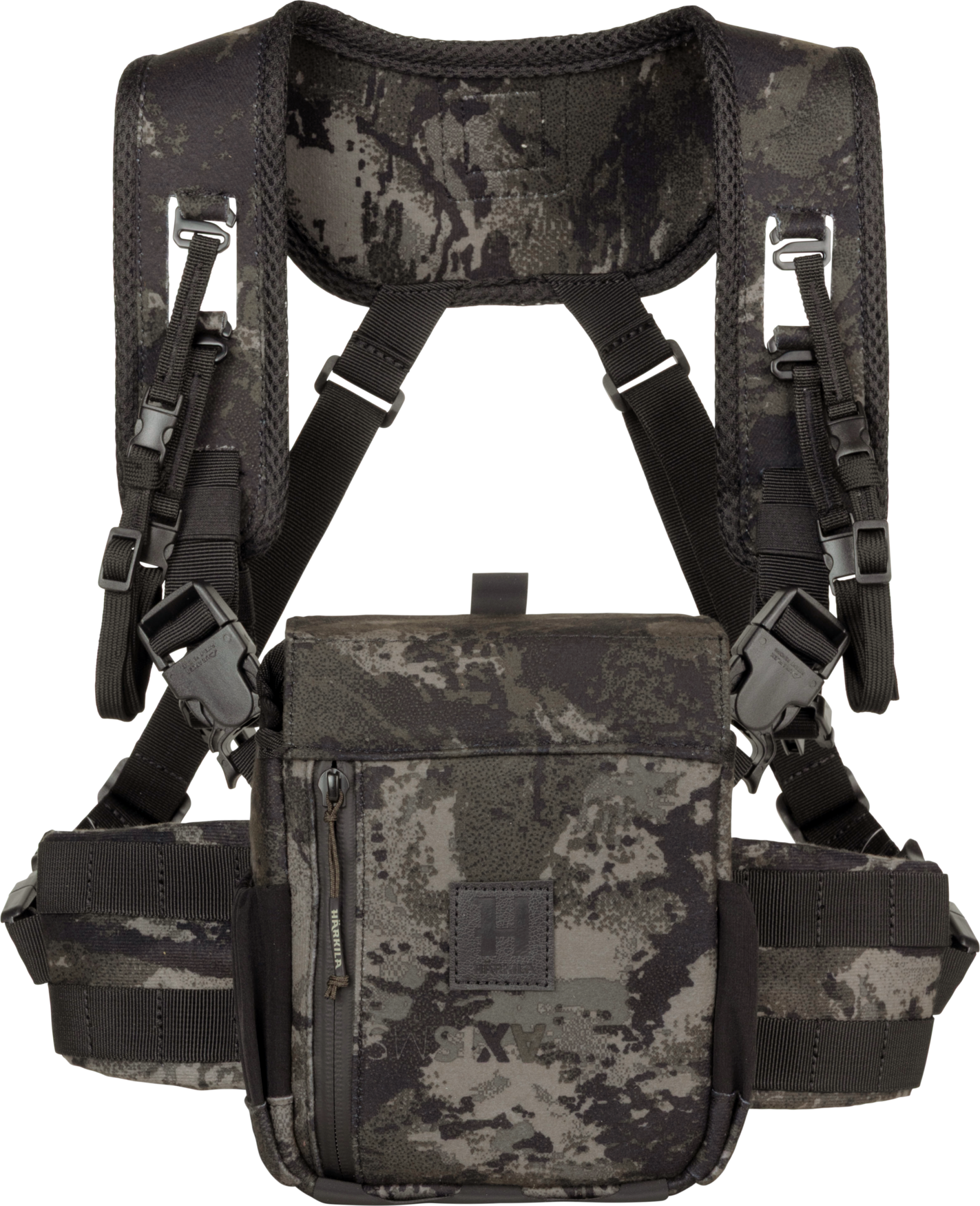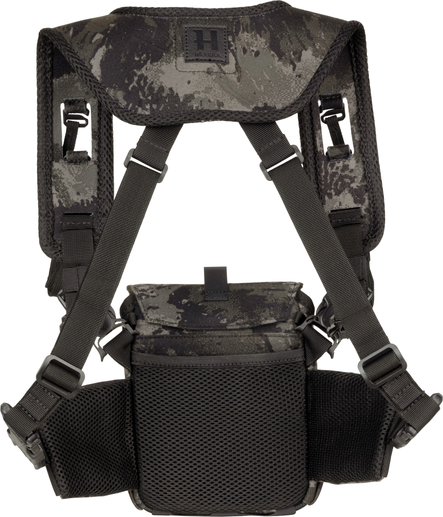 Il portabinocolo Härkila in colore camo, si vedono le cinghie di sicurezza per il binocolo, la tasca laterale elastica che ospita il falconcino di gesso per capire la direzione del vento, la chiusura aperta dotata dei tre magneti silenziosi.